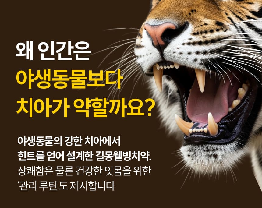 야생동물은 잇몸에 문제가 생기면 바로 먹는 데 타격을 받고, 먹지 못하면 곧 약해집니다. 그 세계에서는 잇몸이 무너지는 것이 곧 생존 문제입니다. 그래서 입안의 바탕이 약할 틈이 적습니다. 길몽웰빙치약은 바로 그 점에서 출발해, 인간의 양치도 치아 표면이 아니라 잇몸부터 다시 보자는 쪽으로 만든 치약입니다.
